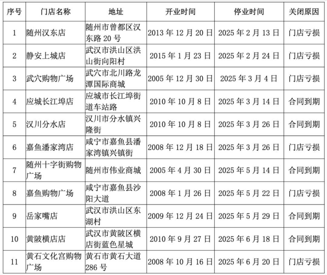 DoNews注意到,年内 中百集团 30家被关闭的仓储大卖场中,23家是由于“门店亏损”,7家由于“合同到期”。其中,不乏营业时间长达20年左右的老店,比如2005年4月30日开业的随州十字街购物广场、2005年12月30日开业的武穴购物广场、2006年12月28日开业的孝感城站路购物广场等,另有武汉K11购物艺术中心店、宜昌方圆荟店等开业仅3年的门店,其它的一些门店开业时间也基本有十多年,可见这次 中百集团 关店力度之大。