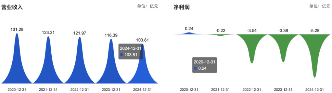 然而,学 习胖 东来进行调改带来的增长,难挽 中百集团 财务数据的颓势。巨潮资讯网数据显示,近5年 中百集团 收入处于持续下滑状态,从2020年的131.29亿元一路下滑到2024年的103.81亿元;净利润在2021年由盈转亏,且亏损金额不断增加,从2021年亏损0.22亿元到2024年亏损5.28亿元,4年共亏损超12亿元。