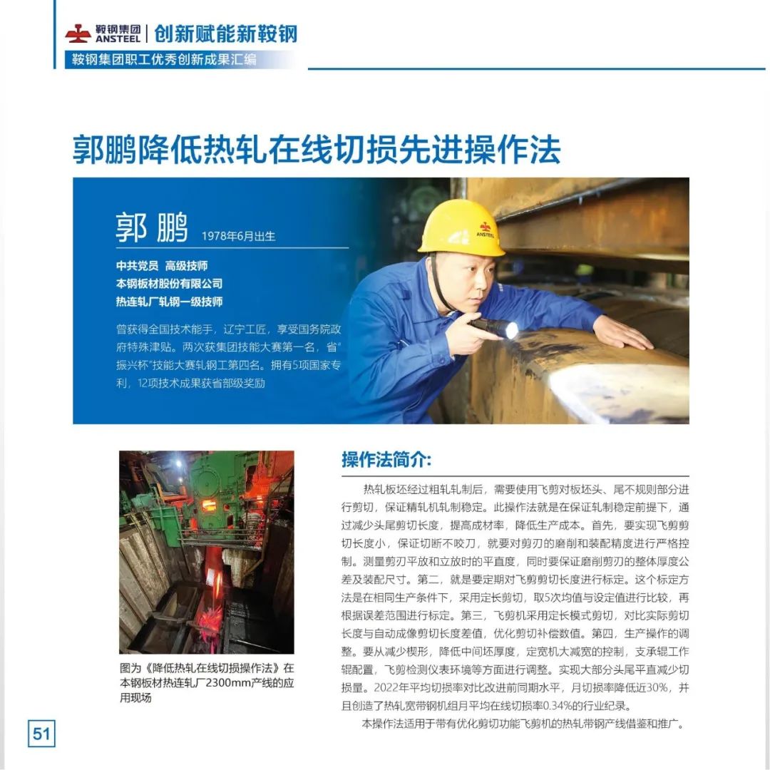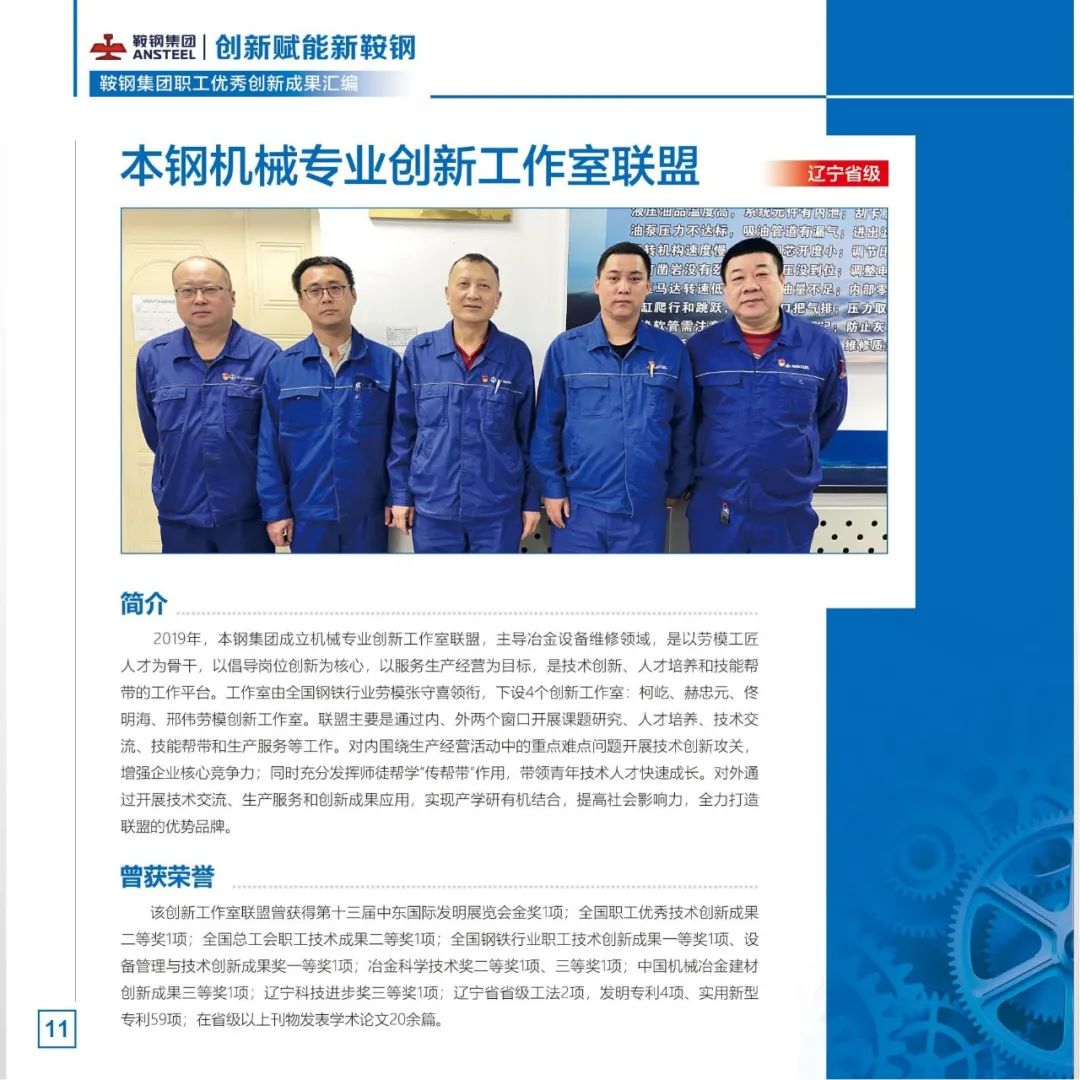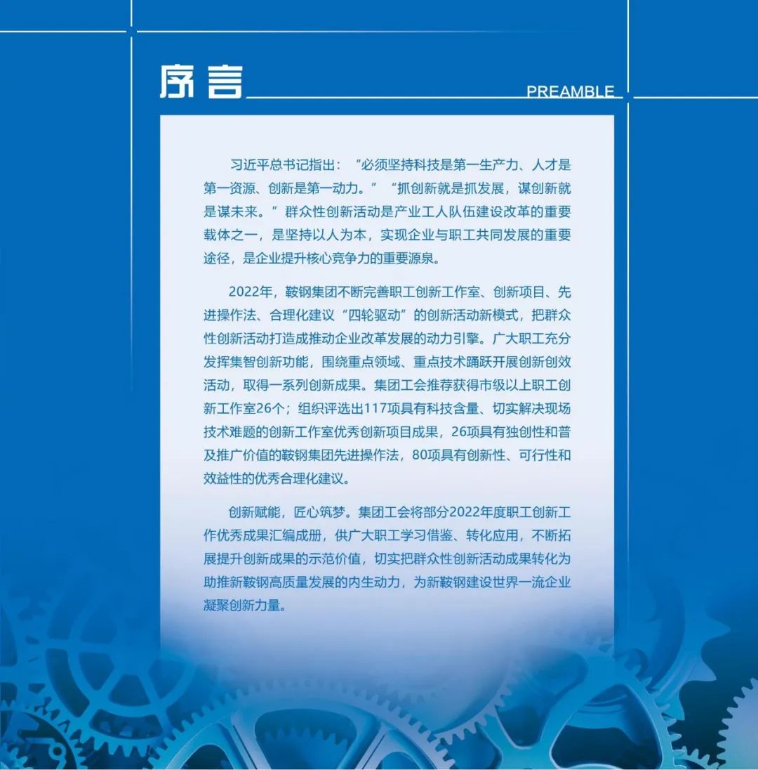 习近平总书记指出,必须坚持科技是第一生产力、人才是第一资源、创新是第一动力。2022年,鞍钢集团不断完善职工创新工作室、创新项目、先进操作法、合理化建议“四轮驱动”的创新活动新模式,把群众性创新活动打造成推动企业改革发展的动力引擎。广大职工充分发挥集智创新功能,围绕重点领域、重点技术踊跃开展创新创效活动,取得一系列创新成果。鞍钢集团工会将部分2022年度职工创新工作优秀成果汇编成册,供广大职工学习借鉴、转化应用,不断拓展提升创新成果的示范价值,切实把群众性创新活动成果转化为助推新鞍钢高质量发展的内生动力,为新鞍钢建设世界一流企业凝聚创新力量。