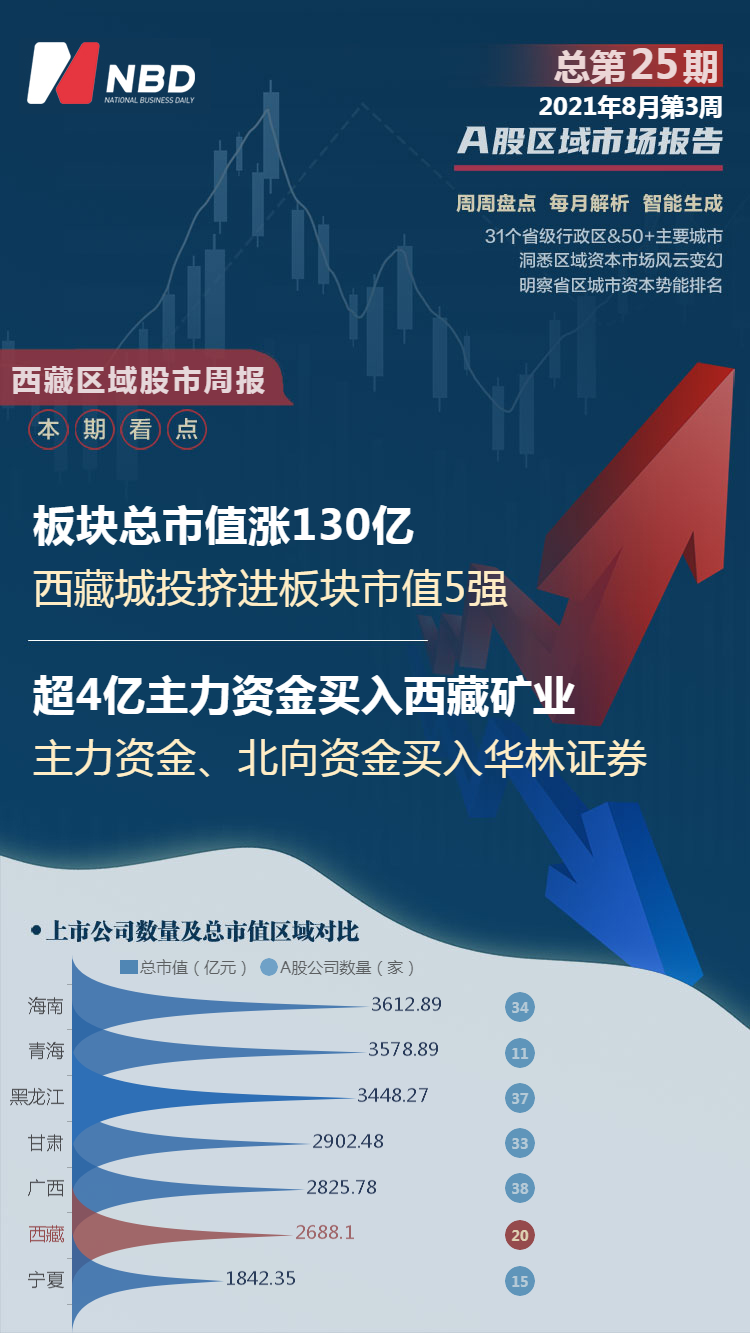 涨跌幅方面,截至2021年8月22日,西藏板块市值与前一周相比,区间涨幅为4.93%(加权平均值),涨幅排名全国第2位。