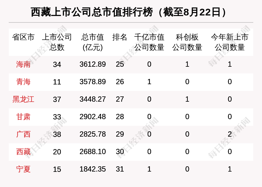 每经AI快讯,截至2021年8月22日,西藏共有A股上市公司20家,板块总市值为2688.10亿元,全国排名第30位,较前一周增加129.69亿元。西藏板块市值最大的是西藏珠峰,市值376.29亿元。