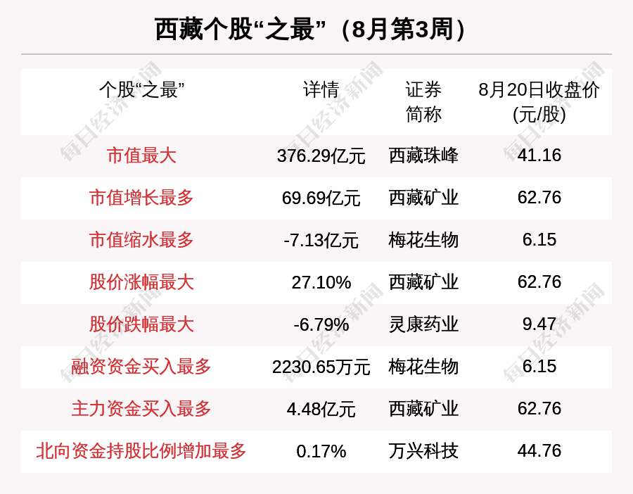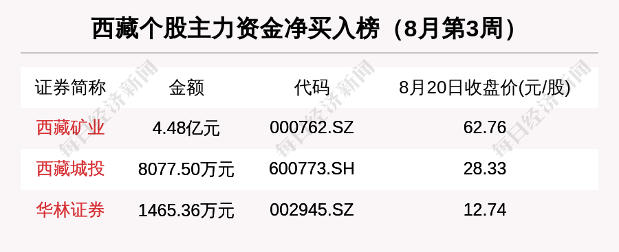 主力资金方面,8月第3周,西藏矿业净买入额居首位,为4.48亿元,其次是西藏城投(8077.50万元)和华林证券(1465.36万元)。