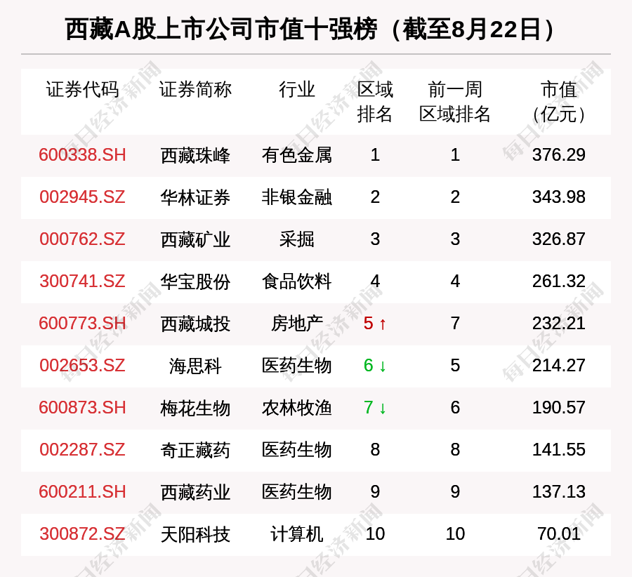 截至8月22日,西藏板块市值最大的是西藏珠峰,市值最小的是*ST西发。上周市值增长最多的是西藏矿业,增长69.69亿元;市值缩水最多的是梅花生物,缩水7.13亿元。