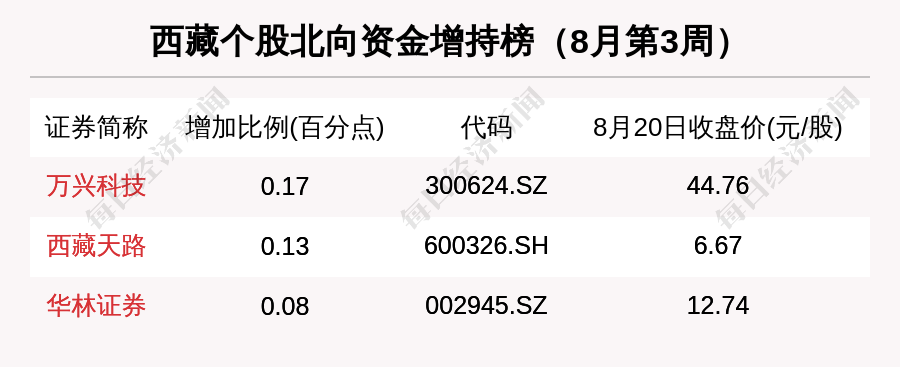再看北向资金,8月第3周,万兴科技北向资金持股比例增加0.17个百分点,西藏天路北向资金持股比例增加0.13个百分点,华林证券北向资金持股比例增加0.08个百分点。