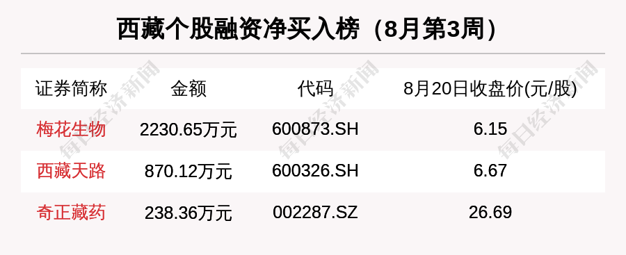先看融资资金,8月第3周,西藏板块融资净偿还总额为3.27亿元。融资净买入最多的西藏股是梅花生物,金额是2230.65万元。其次是西藏天路(870.12万元)和奇正藏药(238.36万元)。