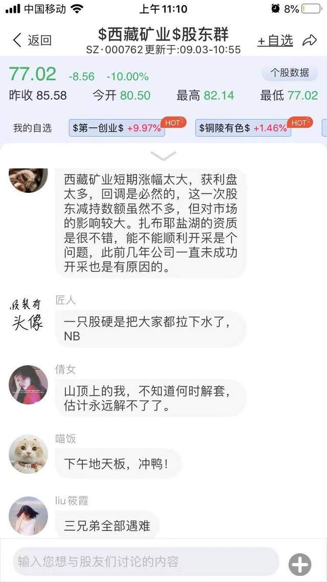 在尺度APP的西藏矿业股东群,有投资者分析称,西藏矿业短期涨幅太大,获利盘太多,回调是必然的,这一次股东减持数额虽然不多,但对市场的影响较大。扎布耶盐湖的资质是很不错,能不能顺利开采是个问题,此前几年公司一直未成功开采也是有原因的,现在深交所问询,可能有助于进一步厘清几个问题,加上锂电板块调整,资金会比较谨慎。