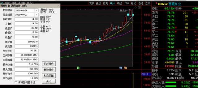“有锂走遍天下”。今年以来,借着锂电池概念,西藏矿业因家里有锂矿一路疯涨,今年4月初,西藏矿业尚在14元左右,到9月2日已涨至86元,最高涨幅达到518%,如果把时间再拉长点,去年9月初,西藏矿业的股价尚在8元上下浮动,仅一年时间,西藏矿业即完成了10倍之旅。