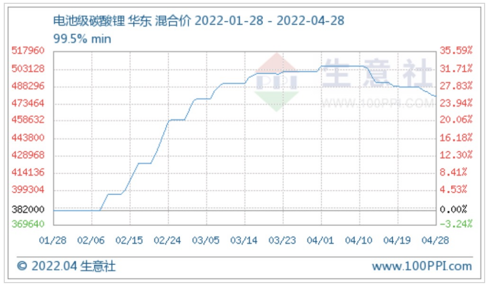 产销量双双大增的同时,锂盐价格也十分给力。生意社监测数据显示,2021年工业级碳酸锂华东地区均价年涨幅达420%,电池级碳酸锂华东地区均价年涨幅达400%。到2022年,碳酸锂价格仍在疯长,3月一度涨超50万元/吨后才有所回调。4月28日,工业级碳酸锂综合价格处于44-47万元/吨,电池级碳酸锂综合价格处于46-49.5万元/吨。