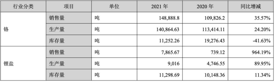 另外,公司另一主打产品铬也量价齐升。2021年生产铬14.09万吨,同比增长24.20%;销售14.89万吨,同比增长35.57%。钛媒体APP了解到,去年铬类产品价格涨幅在20%-25%之间。