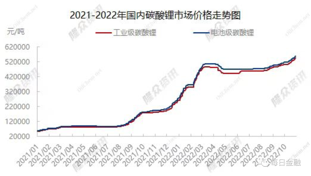 据上海钢联最新数据显示,周五电池级碳酸锂涨4500元/吨,均价报55.9万元/吨,工业级碳酸锂涨4000元/吨,均价报54.50万元/吨,续创历史新高。
