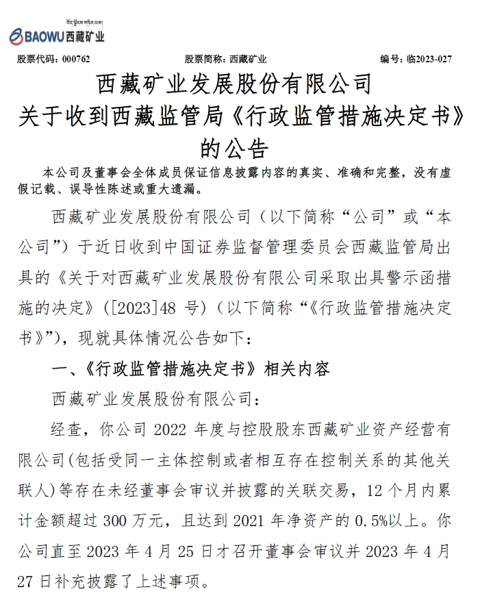 《行政监管措施决定书》显示:“经查,你公司2022年度与控股股东西藏矿业资产经营有限公司(包括受同一主体控制或者相互存在控制关系的其他关联人)等存在未经董事会审议并披露的关联交易,12个月内累计金额超过300万元,且达到2021年净资产的0.5%以上。你公司直至2023年4月25日才召开董事会审议并2023年4月27日补充披露了上述事项。”