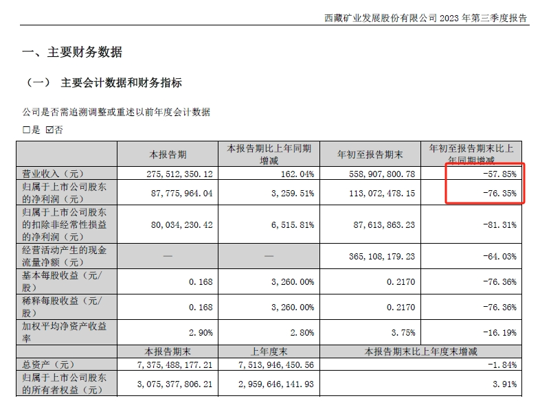 此外,今年前三季度,西藏矿业业绩承压,营收同比下降57.85%、归母净利润同比下降76.35%。