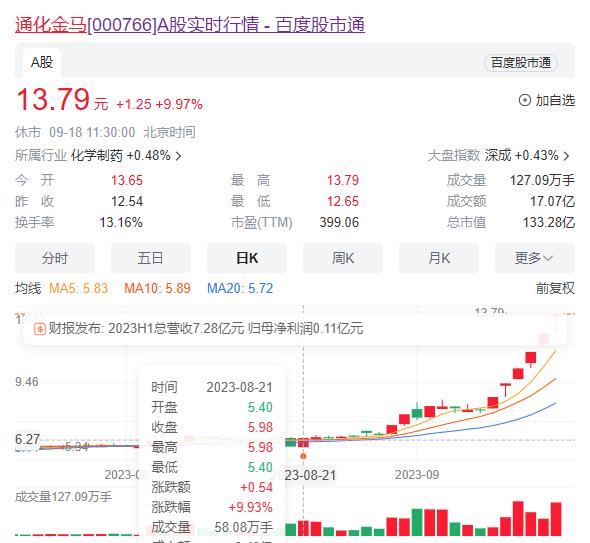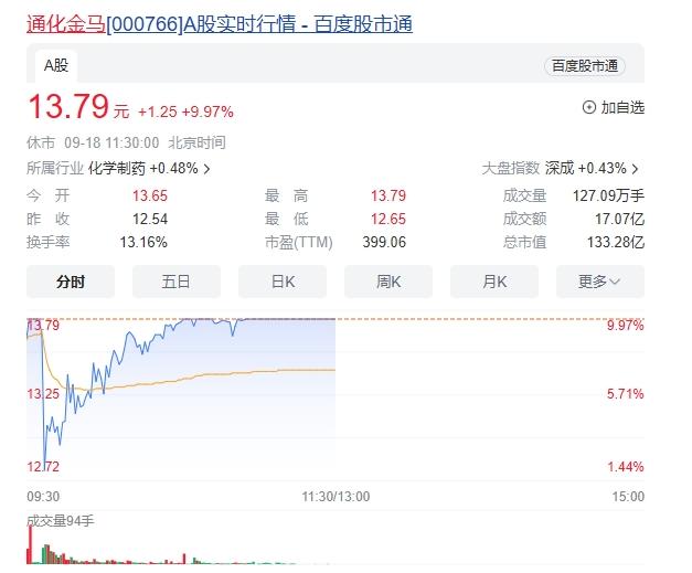 9月18日早间开盘,通化金马(000766)高开8.85%,延续上周猛烈涨势。虽然在9点37分做了个回调的“假动作”,很快又震荡拉升直至涨停封板。截至午间收盘休市,通化金马股价报13.79元/股。