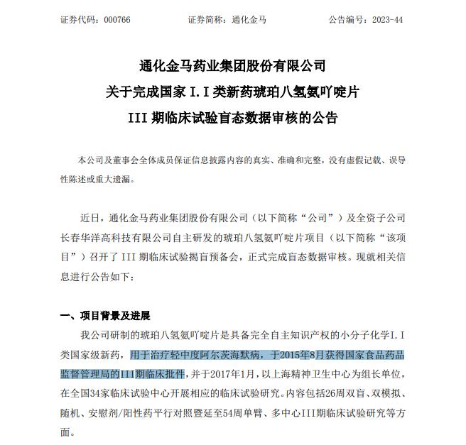 二是,公司自主研发的小分子化药“琥珀八氢氨吖啶片”III期临床试验盲态数据审核的公告近期披露,该药用于治疗轻中度阿尔茨海默病。确认盲态数据审核结论及数据入集决议,正式完成了盲态数据审核,后续将进入上市许可申请的注册准备工作。