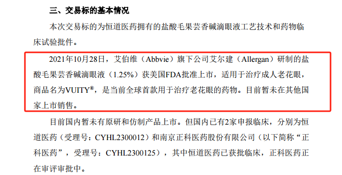 市场容量方面,据中华医学会眼科学分会统计,国内60岁以上老年人白内障发病80%,老花眼52岁以后的发病率近100%。基于国内人口基数和老龄化趋势推测,市场前景有较大想象空间。且目前,国内暂未有原研和仿制产品上市,恒道医药是国内2家申报临床的药企之一。