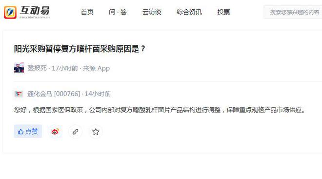 2月29日,通化金马在互动平台回复称,根据国家医保政策,公司内部对复方嗜酸乳杆菌片产品结构进行调整,保障重点规格产品市场供应。