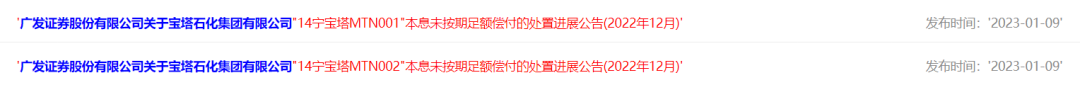 2023年1月9日,广发证券更新发布了关于"14宁宝塔MTN001"“14宁宝塔MTN002”本息未按期足额偿付的处置进展公告(2022年12月),因此成为2023年首家通过北金所发布处置进展公告的券商。
