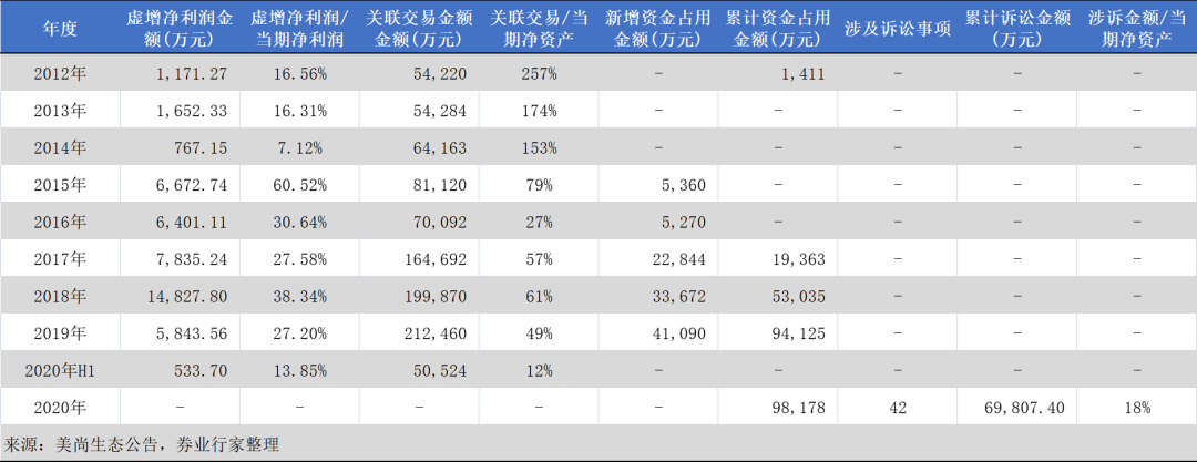 首先是“业绩造假”。美尚生态通过提前确认应收账款收回,虚记银行利息收入,不按审定金额调整项目收入,虚增子公司重庆金点园林有限公司(简称:金点园林)收入等方式,虚增2012年至2020年上半年各期业绩,导致相关招股说明书、定期报告、发行文件中存在虚假记载。合计虚增净利润达4.74亿元,最高占比达60.52%。