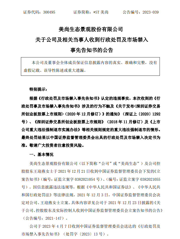 在监管事先告知多时后,4月11日凌晨,*ST美尚(300495.SZ)发布公告称,收到行政处罚及市场禁入事先告知书。