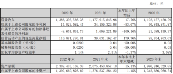 浙江世宝2022年营业收入为13.86亿元,同比增长17.70%;归属于上市公司股东的净利润为1582.36万元,同比下降53.67%;归属于上市公司股东的扣除非经常性损益的净利润为-965.79万元,同比下降700.16%;经营活动产生的现金流量净额为1.11亿元,同比增加179.76%。