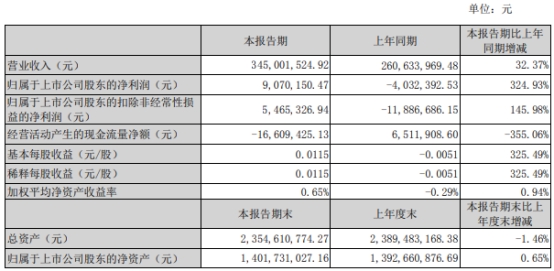 浙江世宝2023年第一季度营业收入为3.45亿元,同比增长32.37%;归属于上市公司股东的净利润为907.02万元,同比增长324.93%;归属于上市公司股东的扣除非经常性损益的净利润为546.53万元,同比增长145.98%;经营活动产生的现金流量净额为-1660.94万元,上年同期为651.19万元。