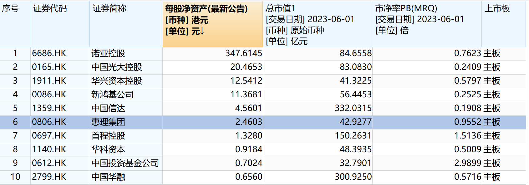 据wind统计,截至6月1日收盘,惠理集团市净率0.96,每股净资产为2.46港元。