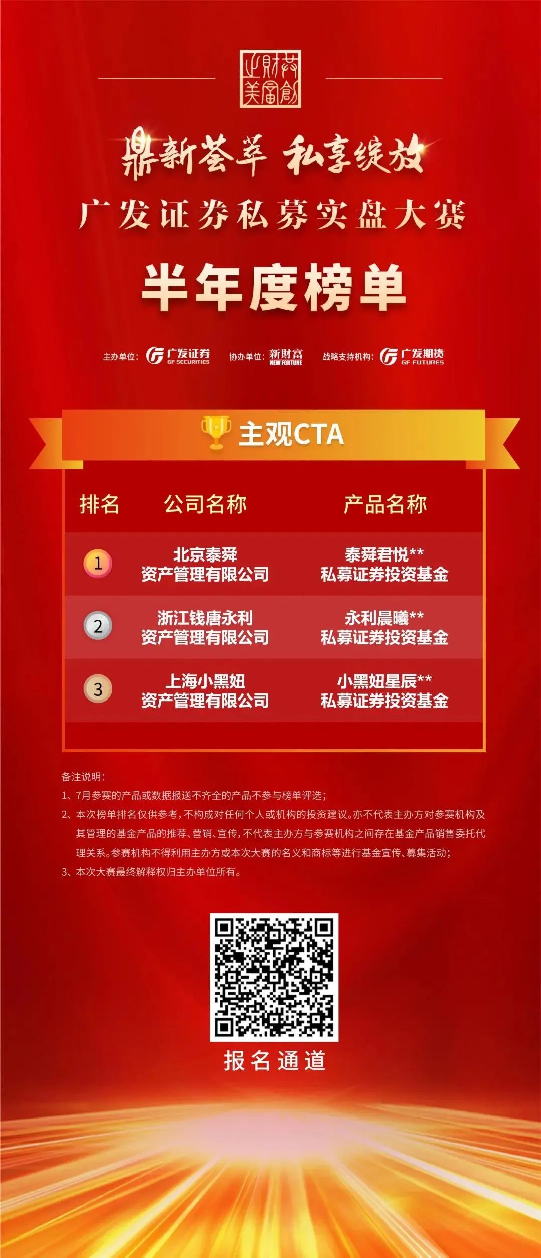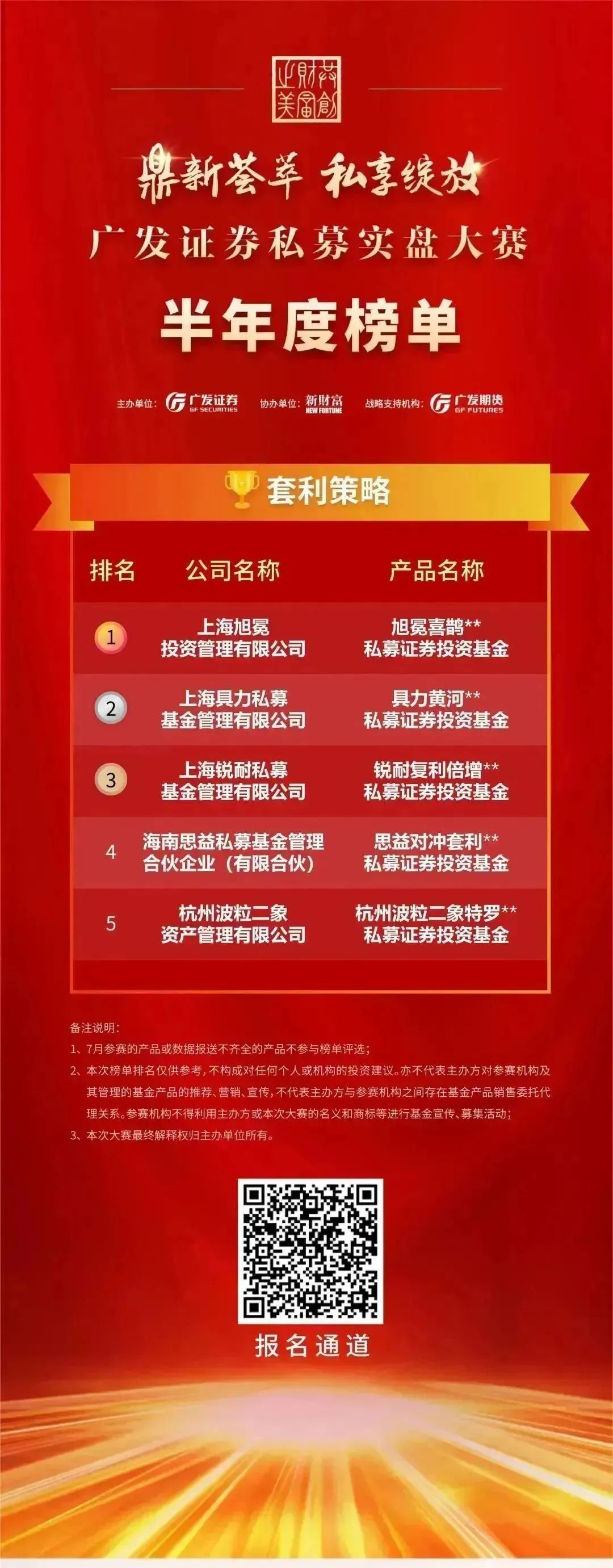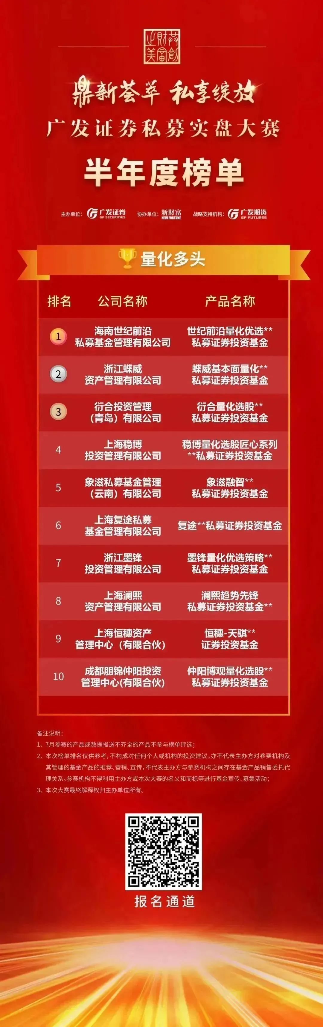 以私募实盘大赛为载体,广发证券致力于为私募基金搭建专业、公正、具有行业影响力的竞技平台及优质的私募基金投资交流圈,在促进私募管理人交流和信息共享的同时,提升私募基金规范运作水平,助力私募管理行业高质量发展。