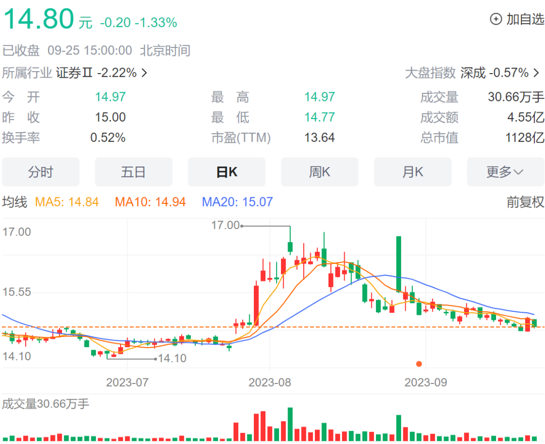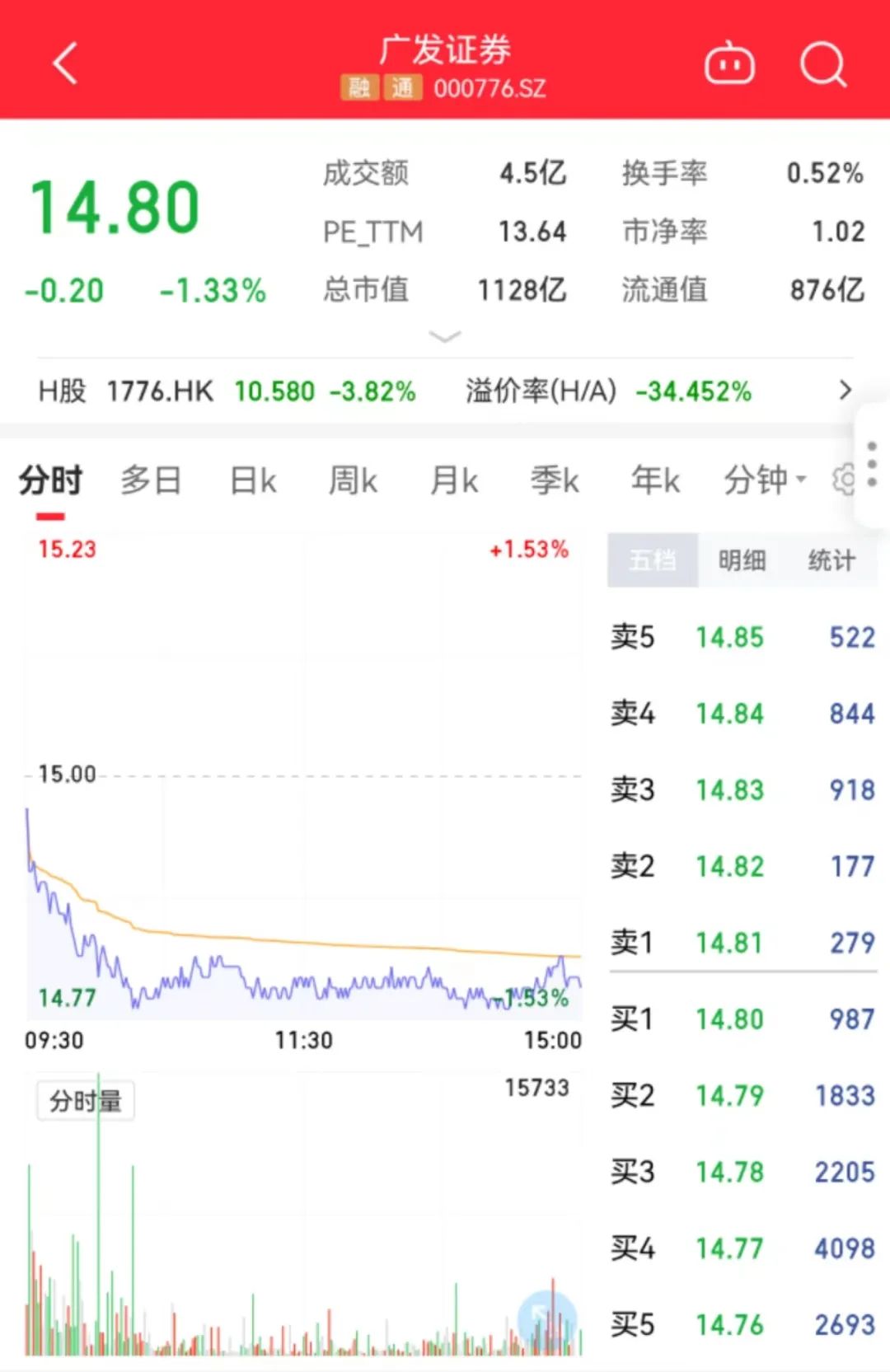 截至9月25日收盘,广发证券报收14.8元/股,跌逾1%。