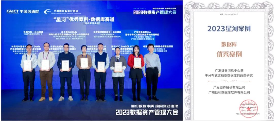 12月21日,数据资产管理大会-数据基础设施论坛成功举办,广发证券云计算消息中心凭借其在基于分布式文档型数据库的系统改造项目中的杰出表现,荣获“星河案例-数据库专项”优秀案例奖。这一荣誉既是对广发证券在技术创新方面的肯定,更是其在金融行业数据库应用领域占据领先地位的重要标志。尤其在非关系型数据库基础设施领域,广发证券展现了其在解决行业关键难题上的明显优势。
