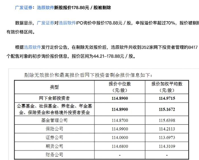 3.4、浩辰软件的申报价格为178.88元/股,在网下投资者报价中位居第一。浩辰软件最终发行价定为103.4元/股,广发证券因高价被剔除配售名单。截至3月22日收盘,浩辰软件报收于68.01元/股,仍跌破发行价。