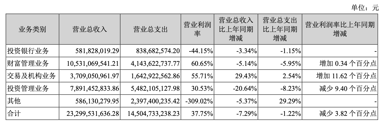 广发证券的主要业务分为四个板块:投资银行业务、财富管理业务、交易及机构业务和投资管理业务。财报数据显示,2023年,除交易及机构业务实现正向增长外,其余三大业务板块全面下滑。