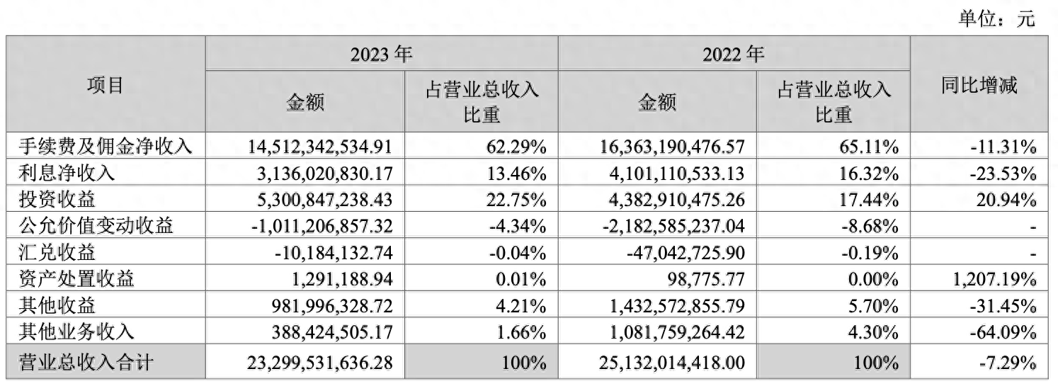 由于手续费及佣金净收入减少,广发证券股份有限公司(简称“广发证券”,000776.SZ)在2023年营收、净利“双降”。
