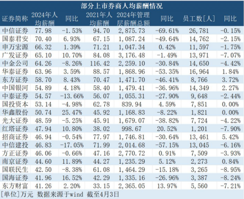 数据显示,截至4月3日,已有24家上市券商披露2024年年报,其中13家券商人均薪酬相较上一年有所上升,占比近五成,以中小券商居多。