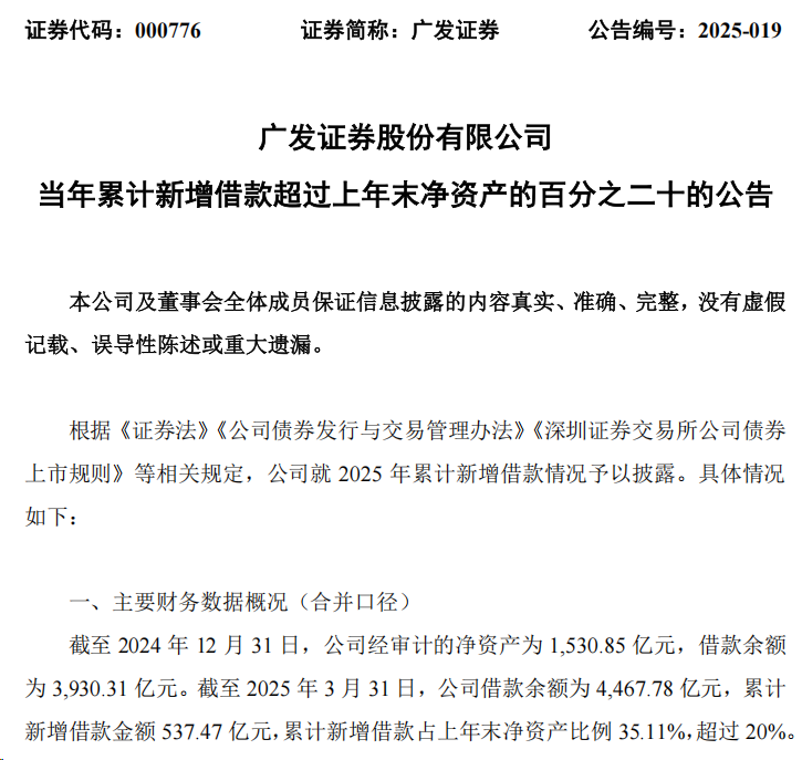 4月7日,广发证券发布2025年累计新增借款情况公告。数据显示,截至2025年3月31日,公司累计新增借款537.47亿元,占2024年末净资产的35.11%,超过监管规定的20%披露阈值。另外,2024年末该公司净资产为1530.85亿元,借款余额3930.31亿元;截至2025年3月末,借款余额增至4467.78亿元。
