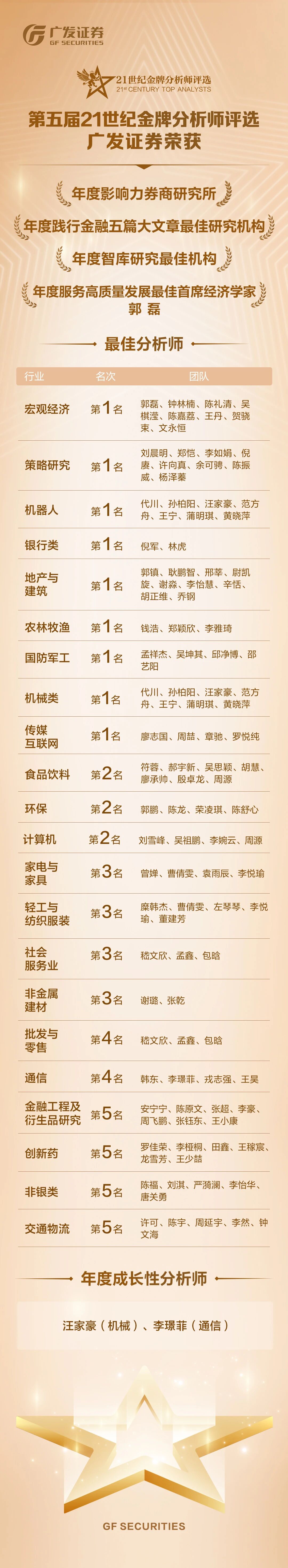 12月6日,第五届21世纪金牌分析师评选结果正式出炉。 广发证券 荣获“2025年度影响力券商研究所”“2025年度践行金融五篇大文章最佳研究机构”“2025年度智库研究最佳机构”三项大奖。 广发证券 首席经济学家郭磊博士荣获“2025年度服务高质量发展最佳首席经济学家”。 广发证券 在22个研究领域荣获“金牌分析师”奖项,汪家豪、李璟菲荣获“2025年度成长性分析师”。