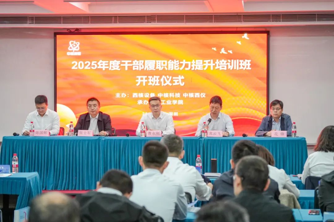 本次培训由中核科技、西核设备、中核西仪联合主办,核工业学院承办,来自三家单位57名中高层干部参训。开班仪式由中核科技党委副书记、纪委书记、工会主席陈国辉主持。中核科技副总经理(主持工作)、党委副书记、总工程师龙云飞,西核设备总经理、党委副书记曹永刚,中核西仪副总经理、总工程师花锋,核工业学院副院长张士军出席开班仪式并致辞。