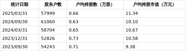 从4月16日公开信息显示,中核科技截至2025年3月31日公司股东户数为5.80万户,较上期(2024年9月30日)增加1299户,增幅为2.29%,变化不大。