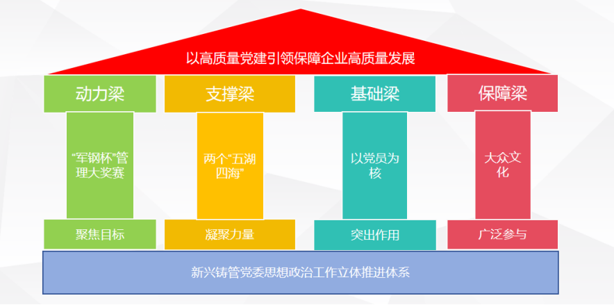 2022年以来,新兴铸管始终坚持把党的政治建设摆在首位,牢牢把握“以高质量党建引领保障企业高质量发展”这一核心目标任务,坚持系统思维、强化顶层设计,统筹推进思想政治工作与生产经营深度融合,持续创新载体、丰富实践路径,先后谋划推出“军钢杯”管理大奖赛、“两个五湖四海”文化理念、“以党员为核、管理网格化”管理创新、“大众文化”体系建设等一系列具有引领性、创新性、支撑性和实效性的重点举措,充发挥房屋结构的“四梁支撑”作用,逐步构建形成了以“聚焦目标、凝聚力量、突出作用、广泛参与”为着力点的新兴铸管党委思想政治工作立体推进体系,不断将党的政治优势、组织优势转化为企业治理效能和发展动能,为企业高质量发展注入强劲精神动力、提供坚实思想保障。