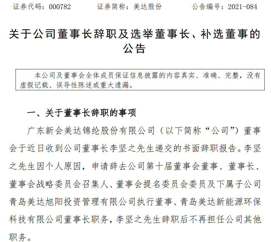 12月23日,美达股份发布公告称,公司董事长李坚之因个人原因,申请辞去美达股份董事长及下属子公司青岛美达旭阳投资管理有限公司(以下简称“美达投资”)执行董事、青岛美达新能源环保科技有限公司(以下简称“美达新能源”)董事长等职务,辞职后不再担任公司其他职务。