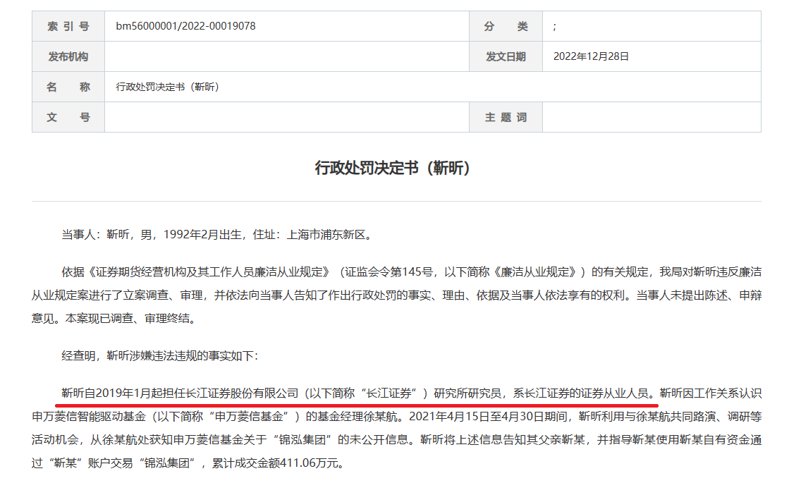 究其原因,原来是徐远航“利用获取的未公开信息明示、暗示他人从事相关交易活动”,而靳昕从徐远航处获知申万菱信基金关于锦泓集团(603518.SH)的未公开信息并告知其父亲靳某进行了交易。