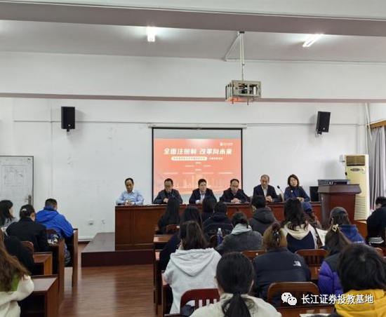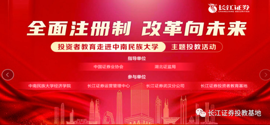 东风随春归,发我枝上花。为积极响应中证协推动投资者教育纳入国民教育体系工作号召,向高校学子宣传介绍中国资本市场全面注册制正式实施这一重大改革举措,帮助高校学生学习了解全面注册制改革重要意义、制度变化,中国多层次资本市场发展目标,培育价值投资理念,筑牢高质量资本市场基石,3月23日下午,由中证协、湖北证监局指导,长江证券投资者教基地、长江证券运营管理中心、武汉分公司,中南民族大学经济学院联合主办“全面注册制改革向未来”投资者教育走进中南民族大学主题投教活动暨2023年长江证券校园招聘会,在中南民族大学经济学院15号楼举行。