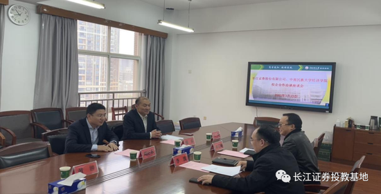 中南民族大学经济学院创建于1984年,其前身为经济管理系,1999年原经济管理系和财经系部分专业合并,正式更名为经济学院。目前,经济学院已发展成为学校师生规模较大、综合实力较强、办学特色鲜明的教学单位。作为首次接触,活动开始前,中南民族大学经济学院院长李波、党委副书记刘君强在经济学院会议室接待了长江证券财富管理中心总经理助理刘运东、投资者教育基地负责人张睿等一行,双方围绕证券期货投资者教育进校园主题进行了广泛交流,在合作开展证券期货知识进高校选修课程、证券期货知识普及宣传教育活动,搭建证券行业校企交流平台,开展实习实践校园招聘等校企合作议题进行了充分沟通,为后续构建“一会、一局、一司、一校”长效合作机制奠定了深厚基础。