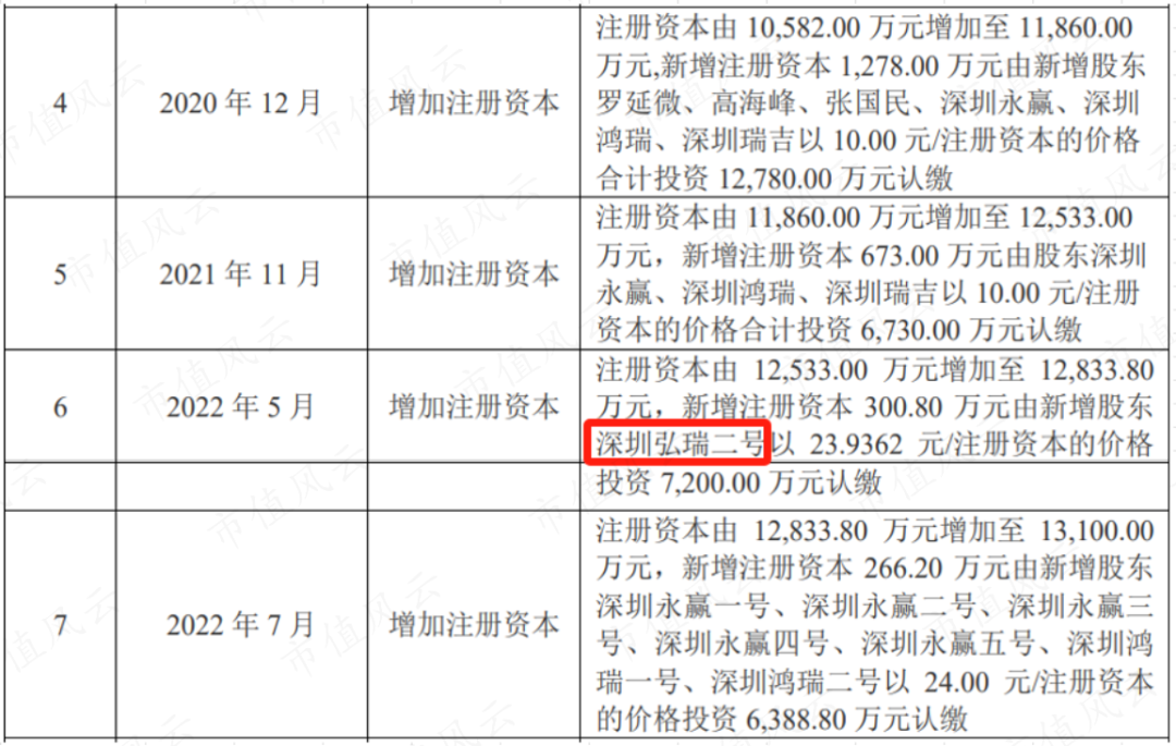 2020-22年的多次增资基本都是公司员工或员工持股平台投的,仅2022年5月的增资是由一家外部机构深圳弘瑞二号投的,当时公司估值也直接从2021的12.53亿上涨2.4倍至31.44亿。