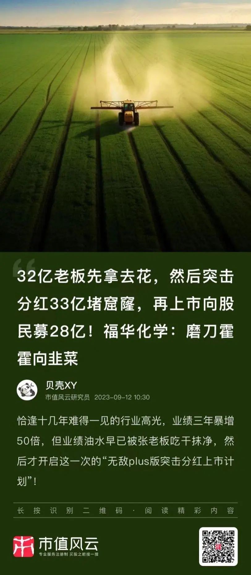 其中福华化学就是一个典型,先从银行借32亿给老板们花,再突击分红33亿抵消老板们的借款,然后再上市向股民募资27.5亿补流,相当于上市募资都提前装老板们口袋了,吃相简直不要太难看。