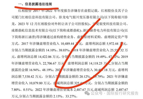 1、连续6年年报造假:处罚书显示,红相股份 2017 年-2022 年年度报告涉嫌存在虚假记载,几个年度中营业额和利润都是假的,尤其是利润,一度占到差不多一半。2017 年涉嫌虚增营业收入 10,489.44 万元,虚增利润总额 5,972.44 万元,分别占当期披露金额的 14.10%、38.03%;2018 年涉嫌虚增营业收入25,559.32 万元,虚增利润总额 14,422.06 万元,分别占当期披露金额的 19.49%、47.72%;2019 年涉嫌虚增营业收入 22,706.67 万元,虚增利润总额 14,118.25 万元,分别占当期披露的金额 16.94%、48.19%;2020 年涉嫌虚增营业收入 30,497.18 万元,虚增利润总额 7,538.42 万元,分别占当期披露金额的 20.12%、29.79%;2021 年涉嫌虚增营业收入 10,879.80 万元,虚减利润总额 325.44 万元,分别占当期披露金额的 7.80%、0.51%;2022 年涉嫌虚增营业成本 2,487.67 万元,虚减利润总额 2,487.67 万元,分别占当期披露金额的 2.15%、33.27%。