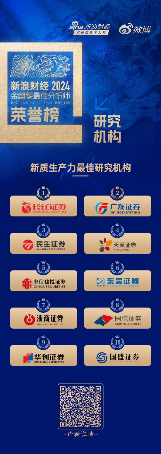第六届新浪财经金麒麟新质生产力最佳研究机构荣誉榜如下: