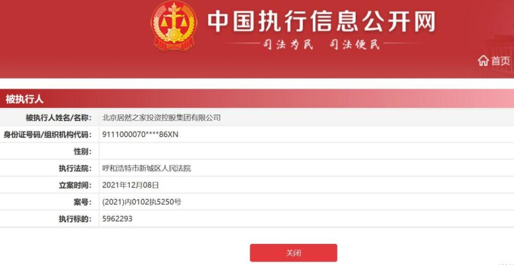 近日,中新经纬从中国执行信息公开网获悉,北京投资控股集团有限公司(下称居然控股)12月8日被呼和浩特市新城区人民法院列为被执行人,执行标的为596.23万元人民币。