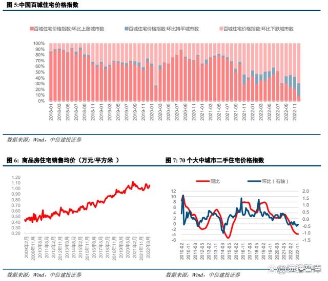 不过,这一趋势已经逐渐触底迎来反转。2022年11月、12月商品房住宅价格分别环比提升 0.0139、0.0384万元/平方米,房价已经止跌。2022年12月,70个大中城市二手住宅价格指数同比仍然下降较多,不过环比降幅已经开始稳定。