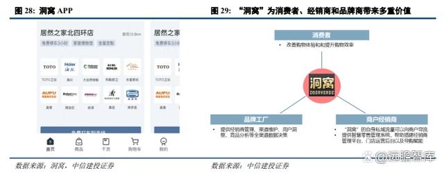 (1)对于消费者,家居建材行业具有低频、高客单、重体验、重服务的特点,因此,线上销售无法完全取代线下卖场,家居行业的数字化重点应该为改善购物体验和和提升购物效率。“洞窝”集中了多个卖场、多个商户,方便消费者一站式便捷选购产品,不必花费大量时间线下游览选购,线上初选后线下商场体验购买。