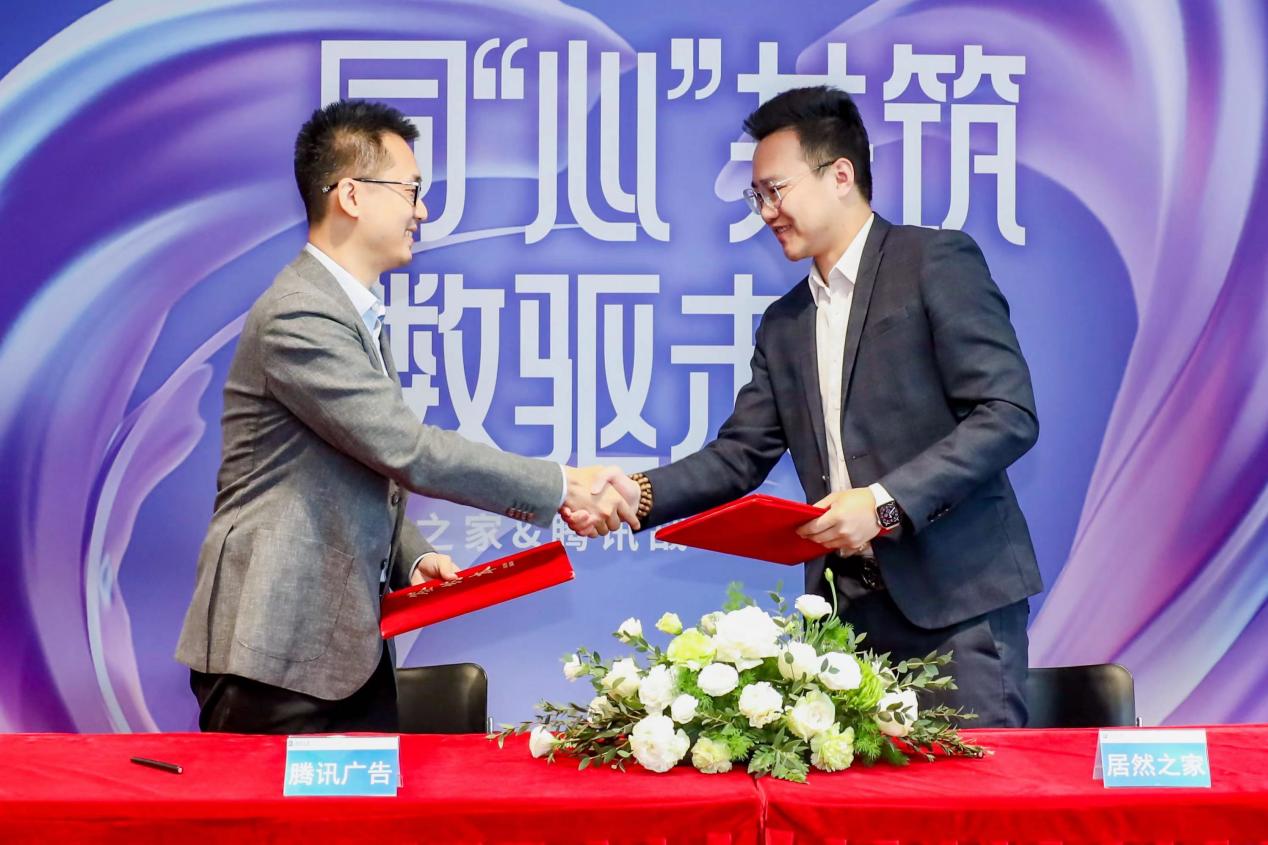 居然之家营销总监吕欢(右)、腾讯广告渠道生态合作部副总经理张磊(左)作为双方代表完成签约